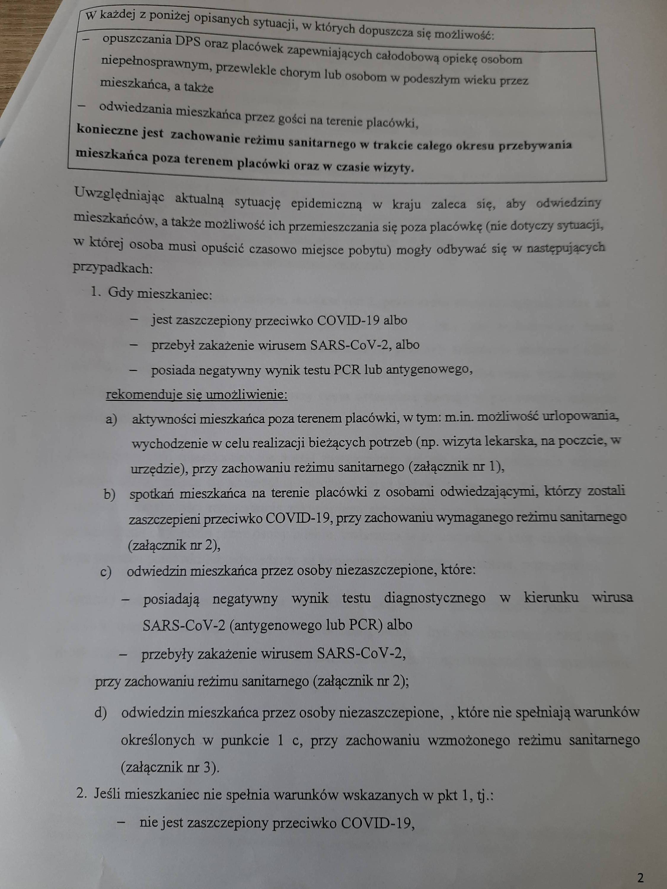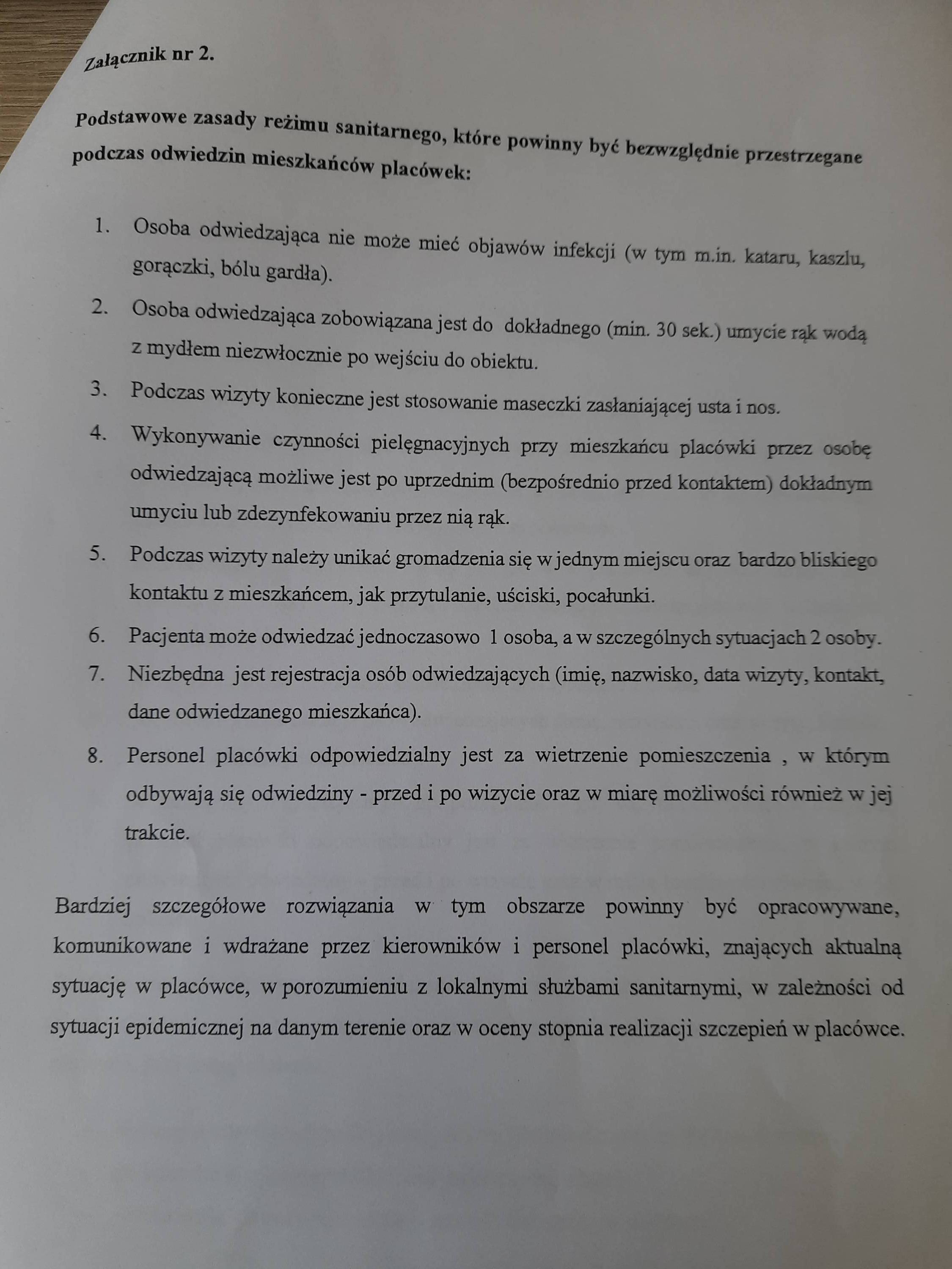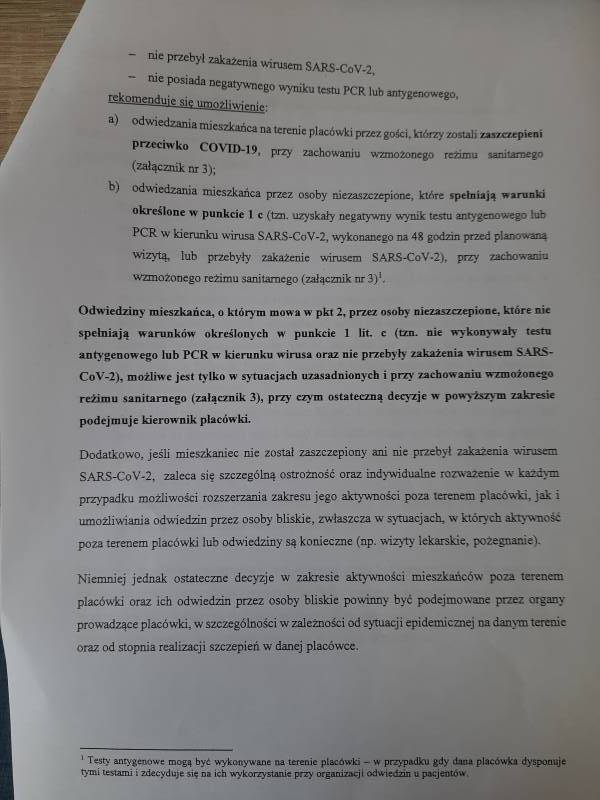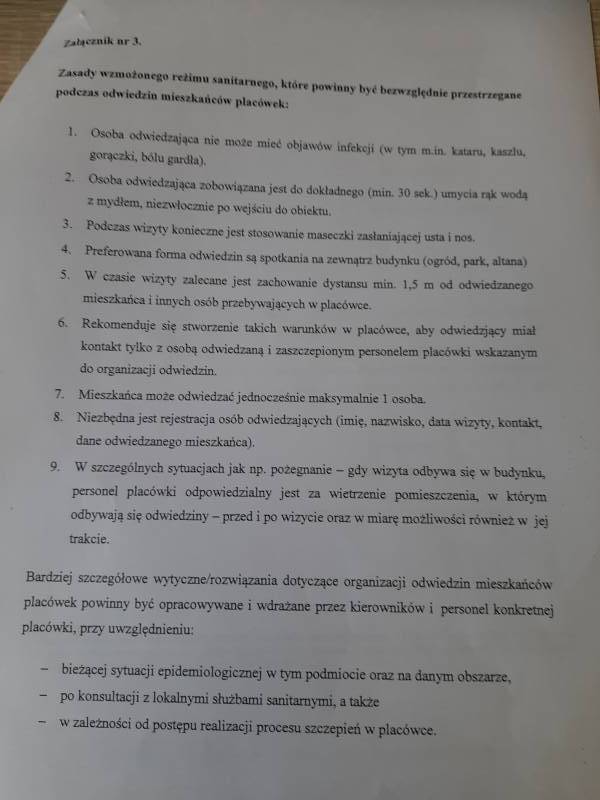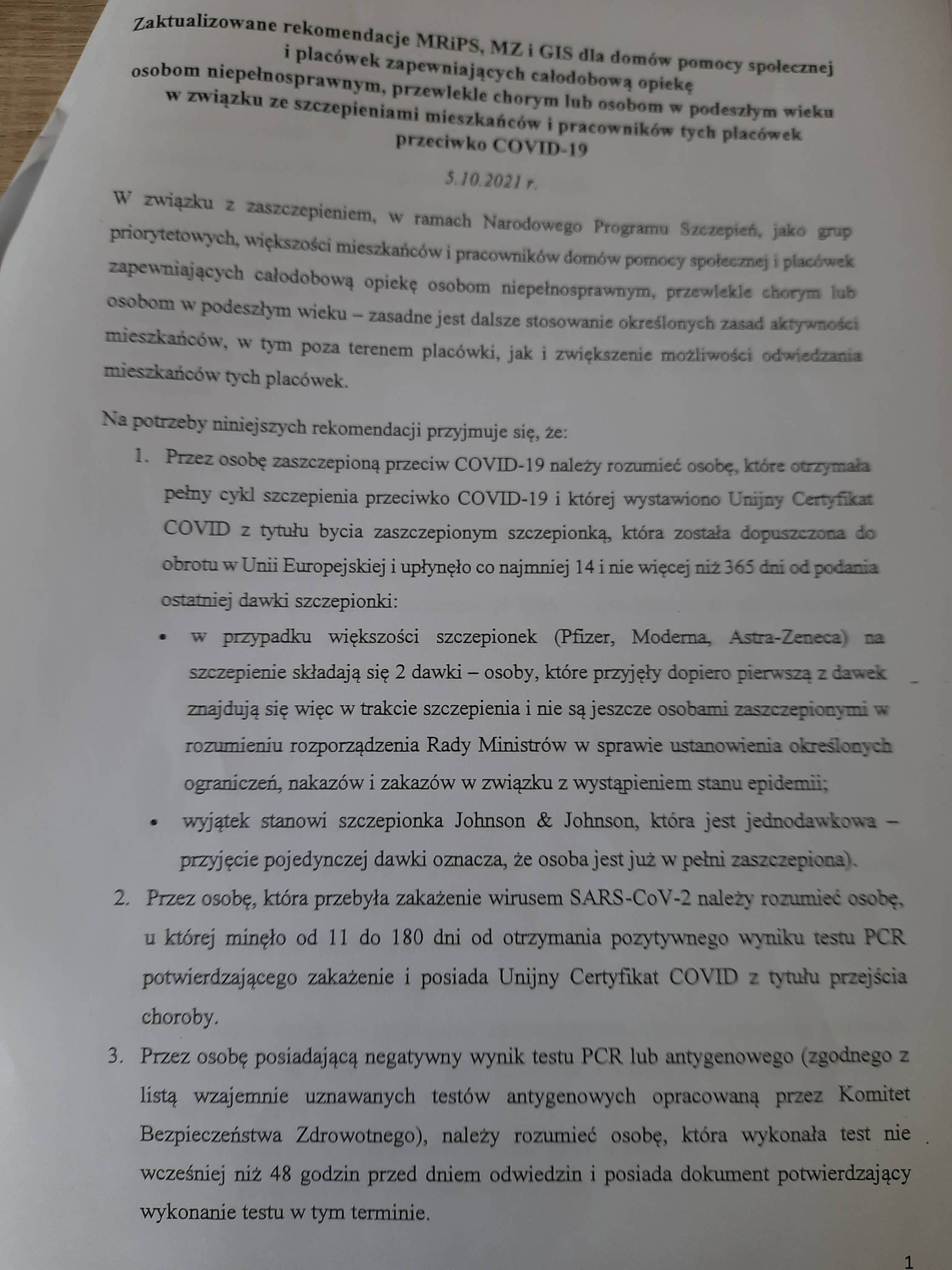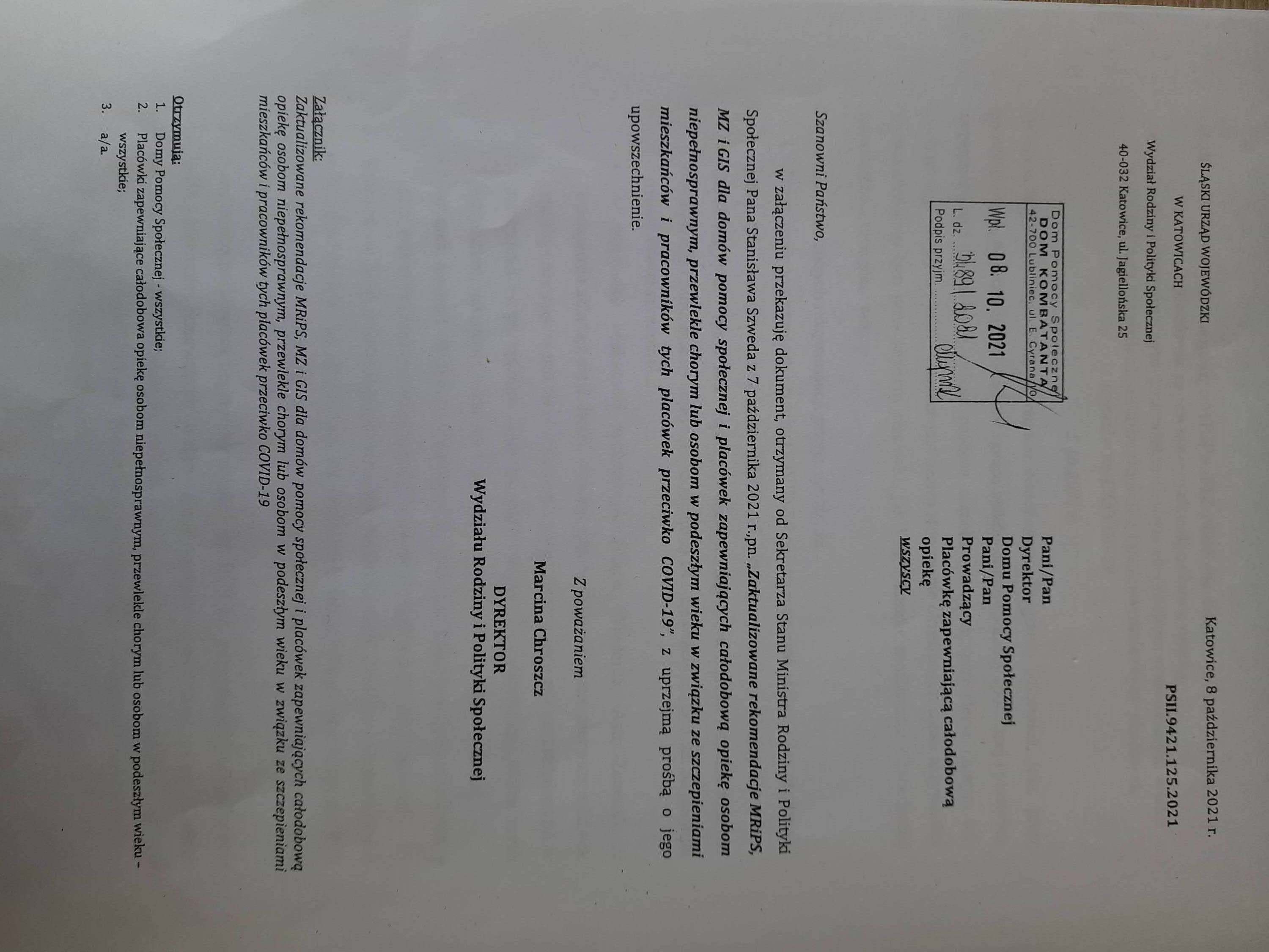 W załączeniu przekazujemy dokument otrzymany od Sekretarza Stanu Ministra Rodziny i Polityki Społecznej Pana Stanisława Szweda z 7 pażdziernika 2021r., pn. ,,Zaktualizowane rekomendacje MRiPS, MZ i GIS dla domów pomocy społecznej i placówek zapewniających całodobową opiekę osobom niepełnosprawnym, przewlekle chorym lub osobom w podeszłym wieku w związku ze szczepieniami mieszkańców i pracowników tych placówek przeciw COVID-19".