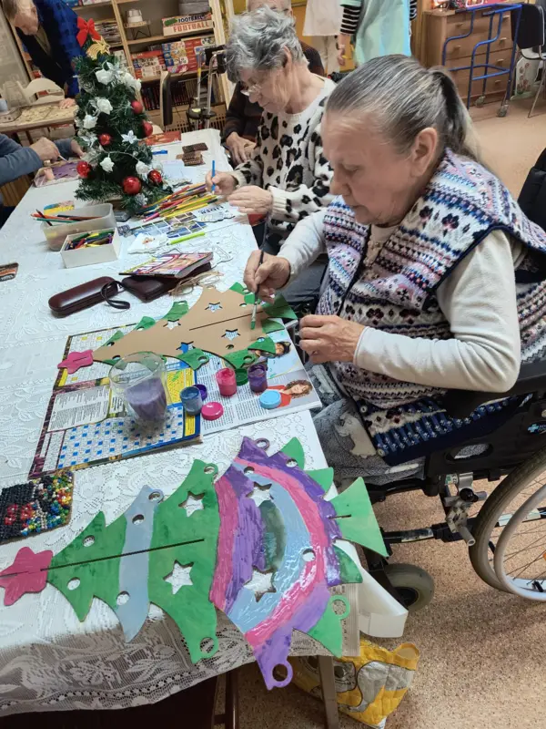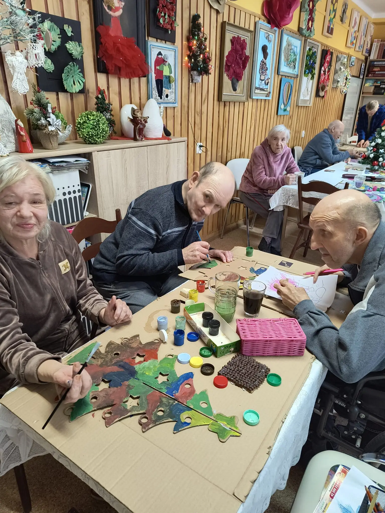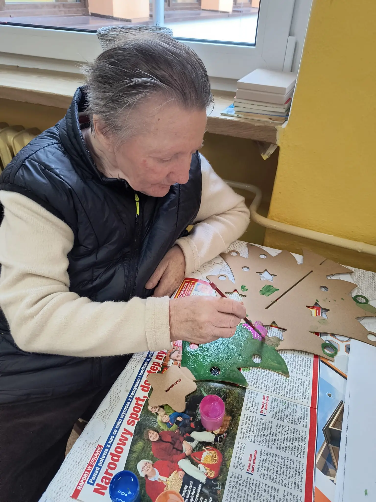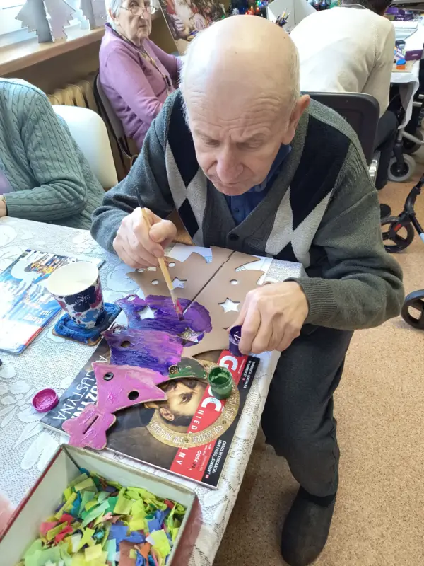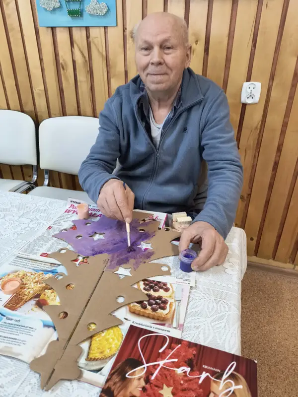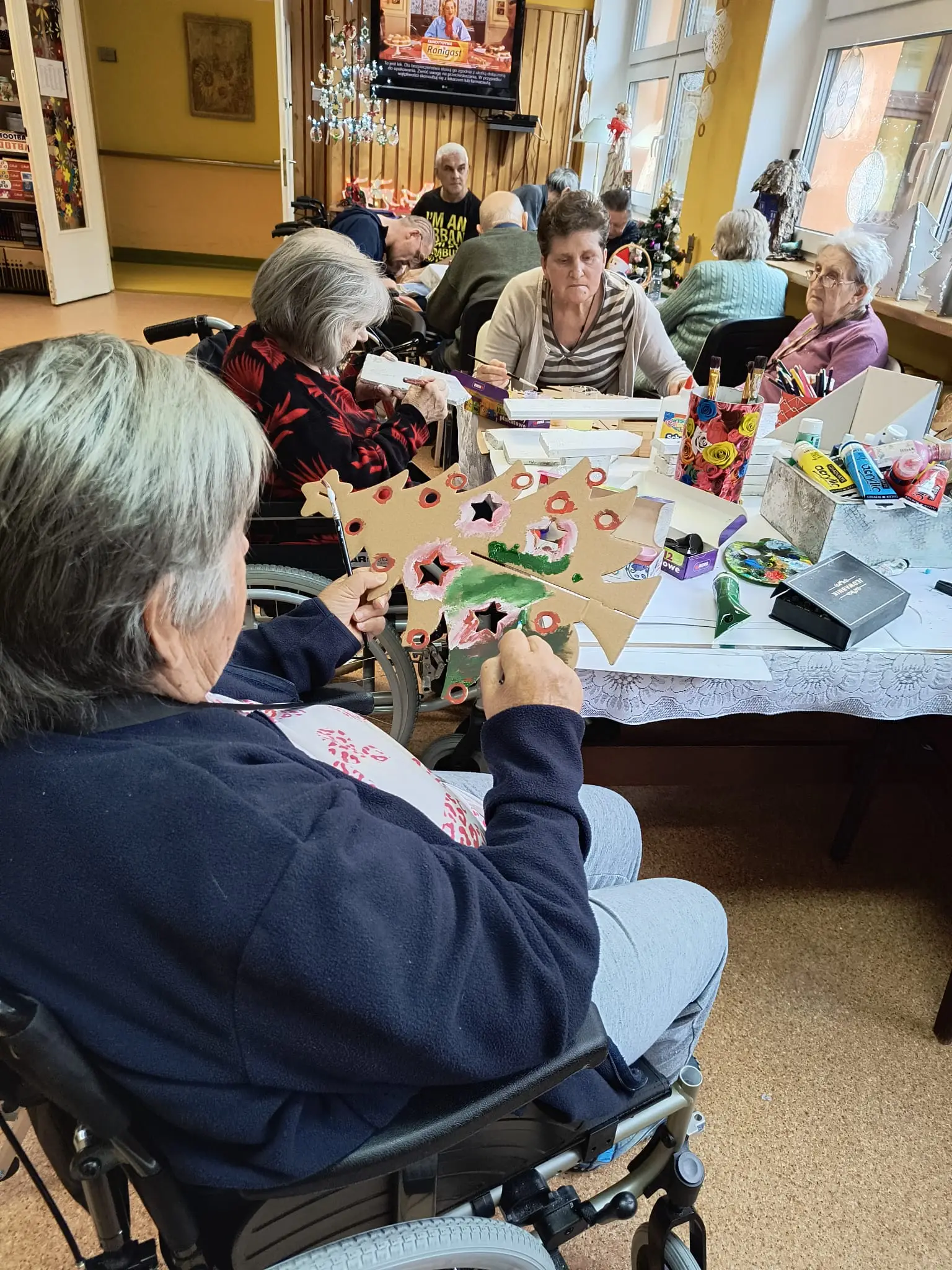 Podczas zajęć plastycznych nasi mieszkańcy z ogromnym zaangażowaniem malowali kartonowe ozdoby, które posłużyły do świątecznego wystroju naszego Domu. Każdy mógł wyrazić siebie na swój własny sposób – jedni tworzyli delikatne, staranne wzory, inni odważnie i swobodnie prowadzili pędzel, nadając pracom wyjątkowy charakter.