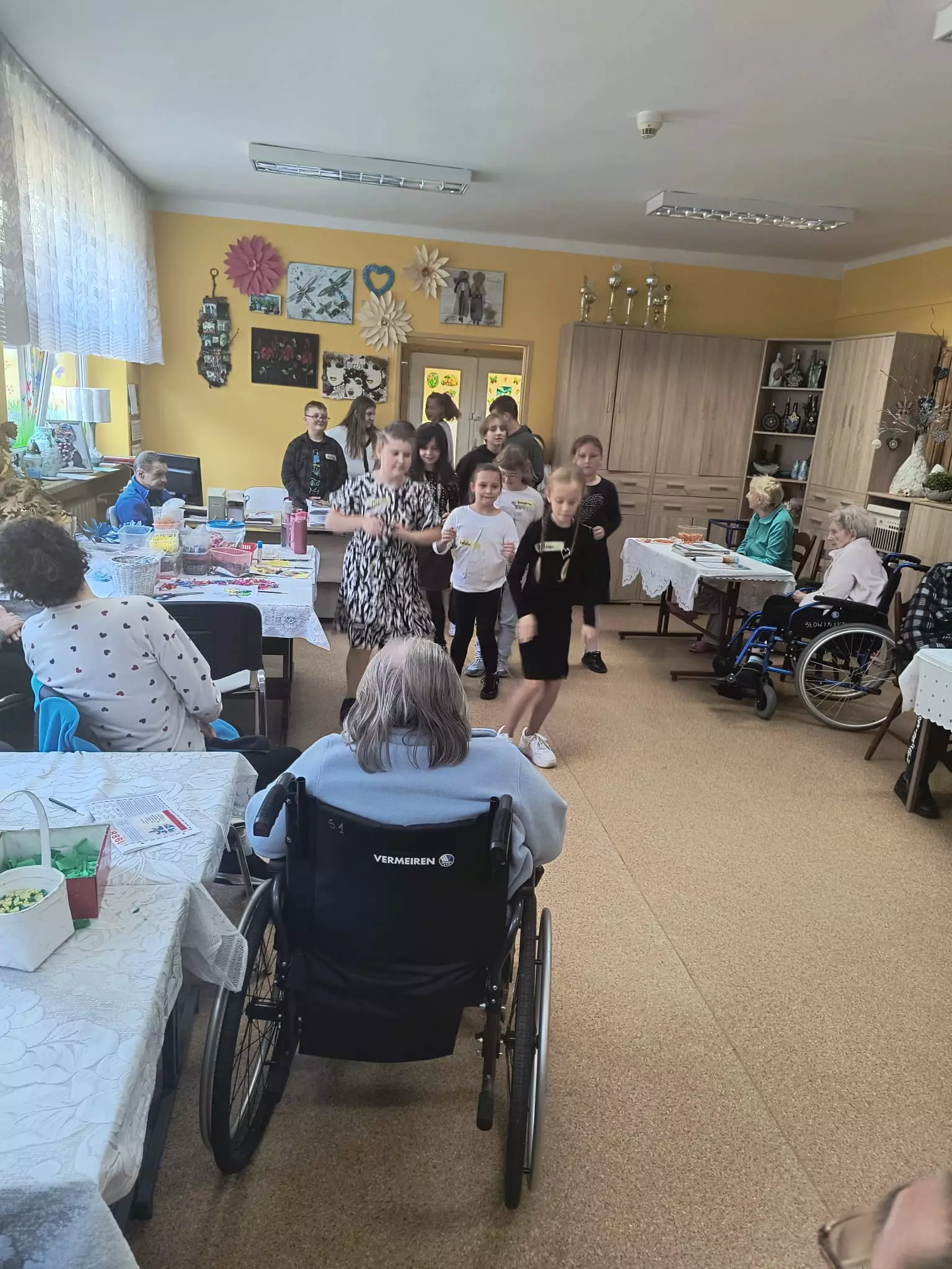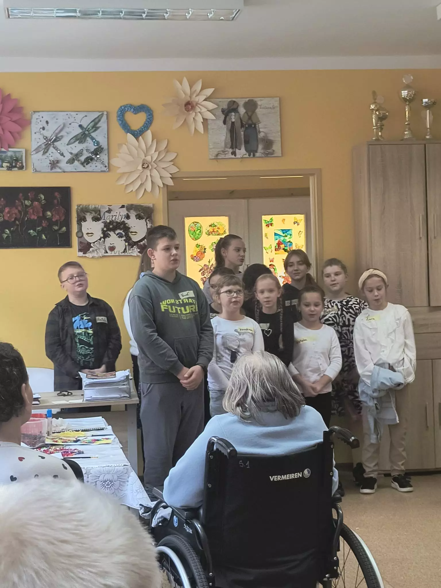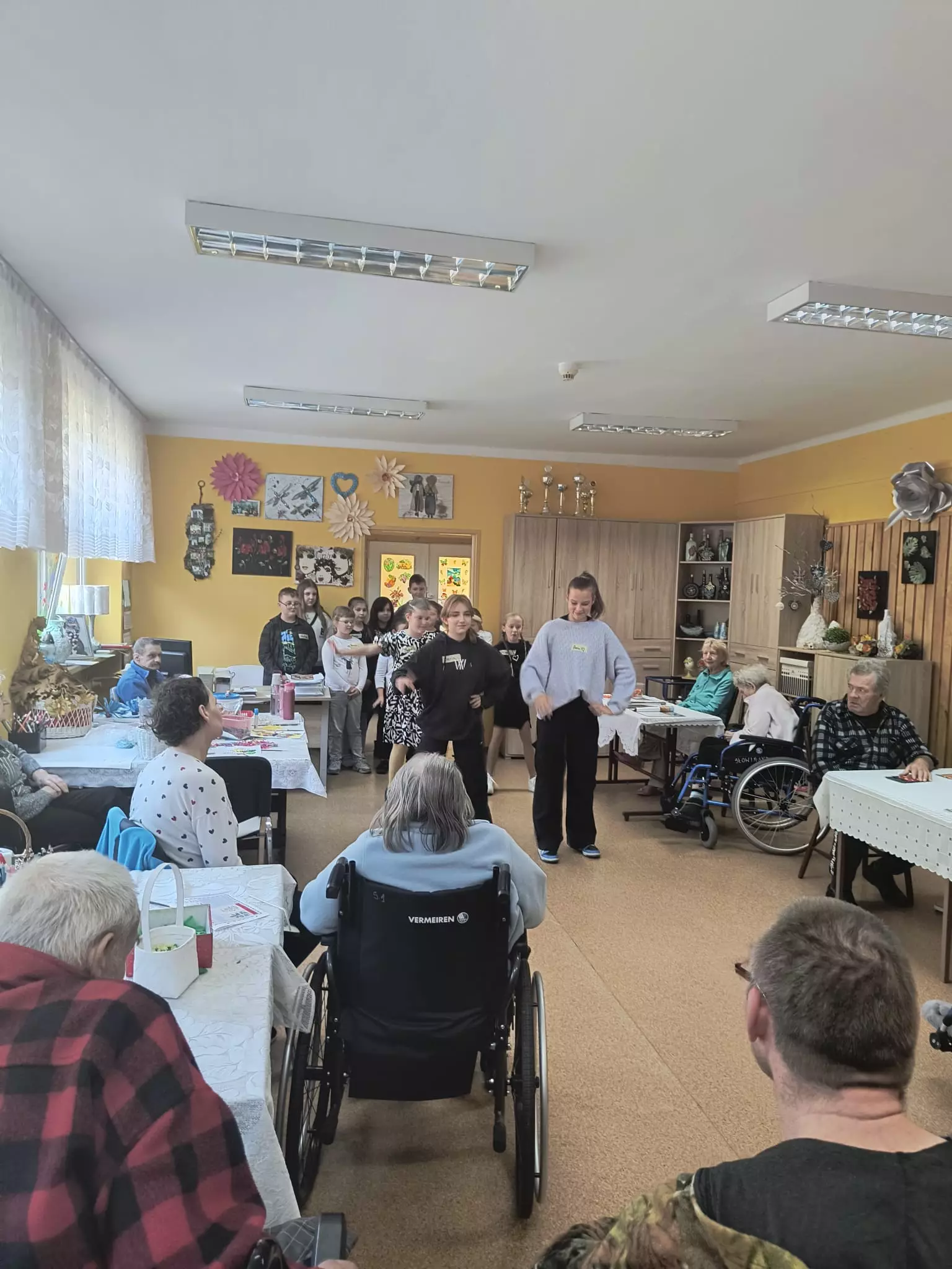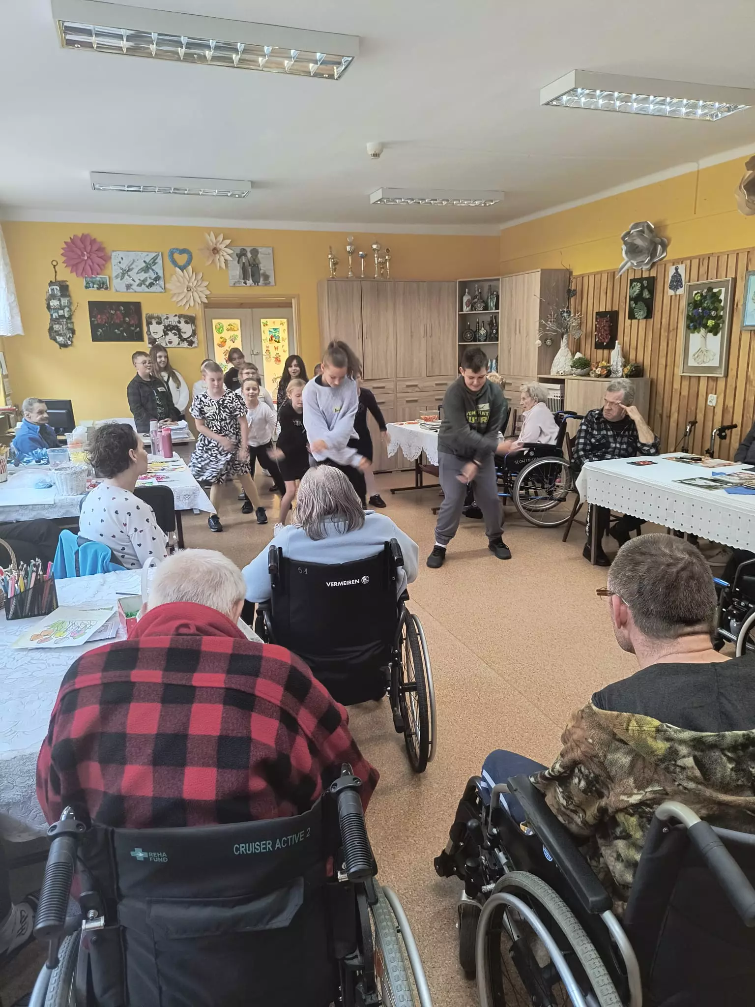Dzisiaj zaszczyciły nas swoją obecnością dzieci, które uczęszczają do szkoły podstawowej nr 4 w Lublińcu. Dzieci z różnych klas, które po przedstawieniu się zaprezentowały nam nowoczesne formy tańca, zaśpiewały wspólnie piosenki oraz malowali farbami ,kredkami symbol jesieni „Jesienne drzewo”. Były prezenty dla naszych podopiecznych rozgrzewająca herbatka i coś słodkiego a przede wszystkim piękne i radosne uśmiechy ,którymi dzieci dzieliły się z naszymi mieszkańcami. Zadowolenie naszych podopiecznych było ogromne takie spotkania są bardzo ważne dla naszych mieszkańców jaki i dzieci. Dziękujemy i z niecierpliwością czekamy na kolejne spotkanie.