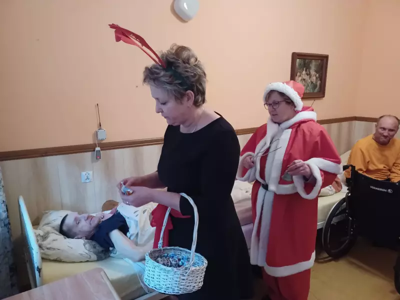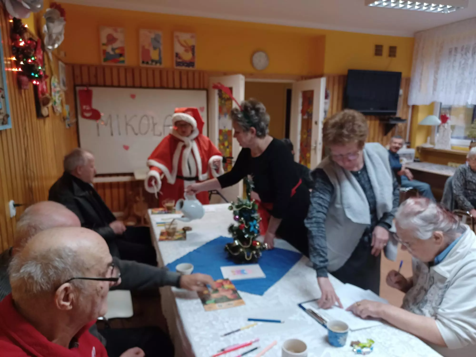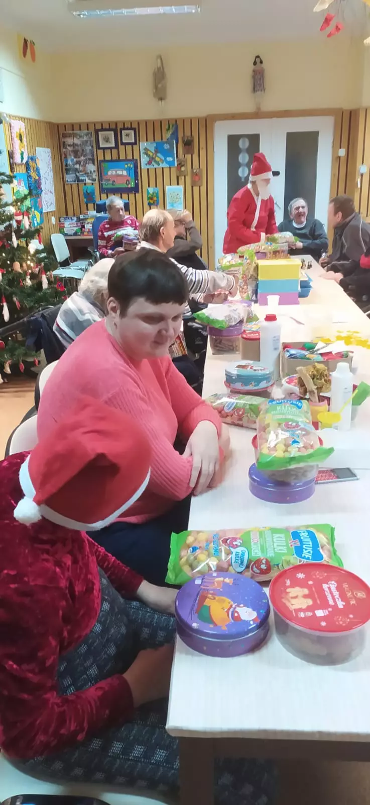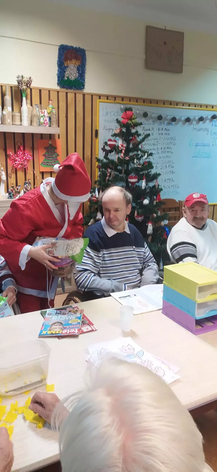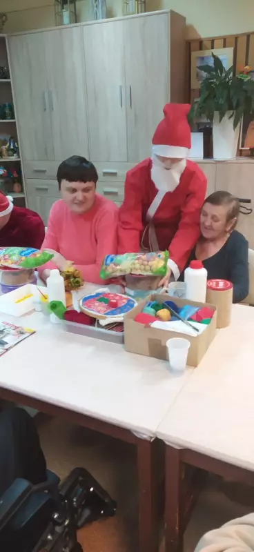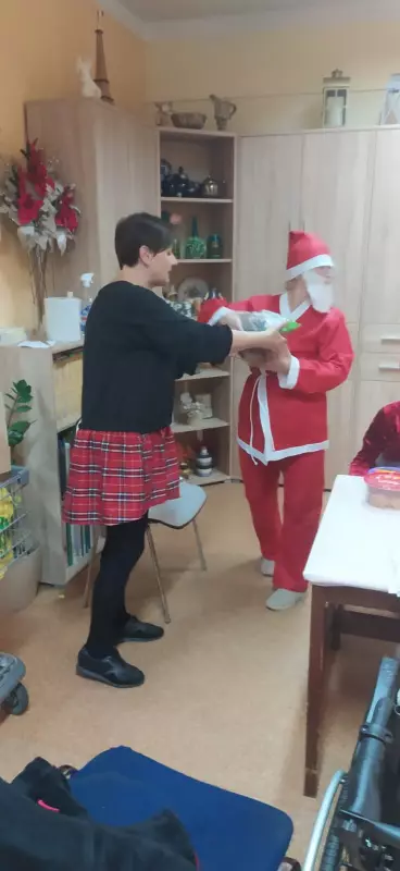 6 grudzień to data wszystkim dobrze nam znana w ten oto bowiem dzień do grzecznych dzieci przychodzi św. Mikołaj aby obdarować wszystkich prezentami. Jednak nie tylko dzieci obchodzą mikołajki my również postanowiliśmy przygotować się na spotkanie z doręczycielem prezentów bądź rózgi jeśli ktoś był niegrzeczny. Wszyscy z niecierpliwością oczekiwaliśmy aby pojawił się, wspólnymi siłami i głosem wołaliśmy ,,Mikołaju, Mikołaju”. I w końcu zjawił się z wielkim worem prezentów. Wszyscy ucieszyli się na jego widok zanim jednak doszło do rozdawania paczek, Mikołaj pogawędził sobie mieszkańcami. Czas minął miło w nastrojowej świątecznej muzyce. Mamy nadzieję, że do zobaczenia w przyszłym roku Święty Mikołaju!!!