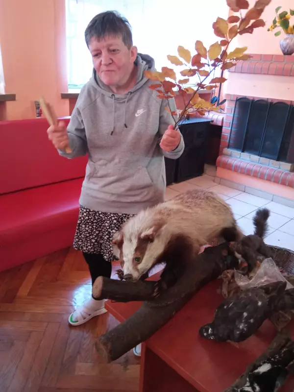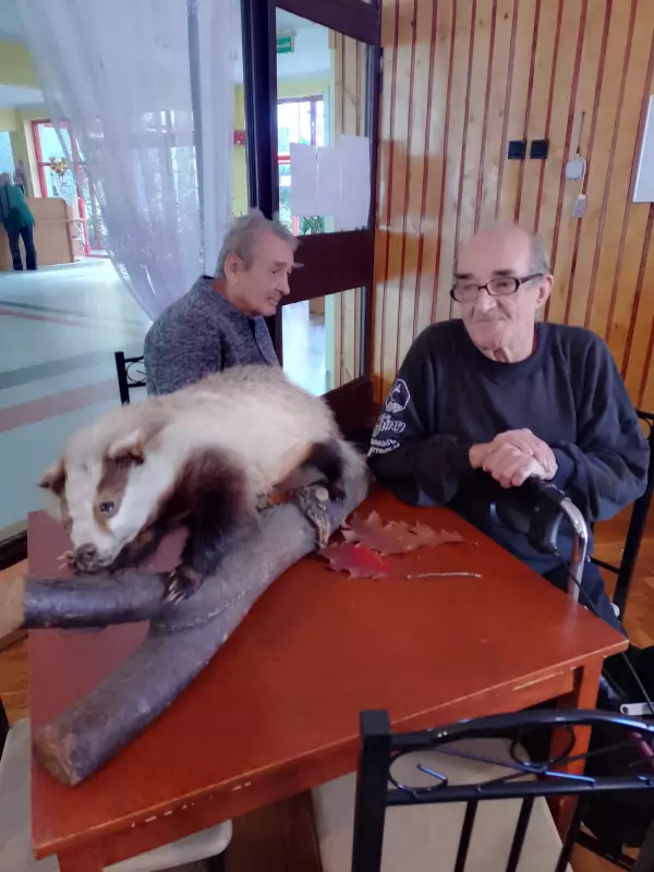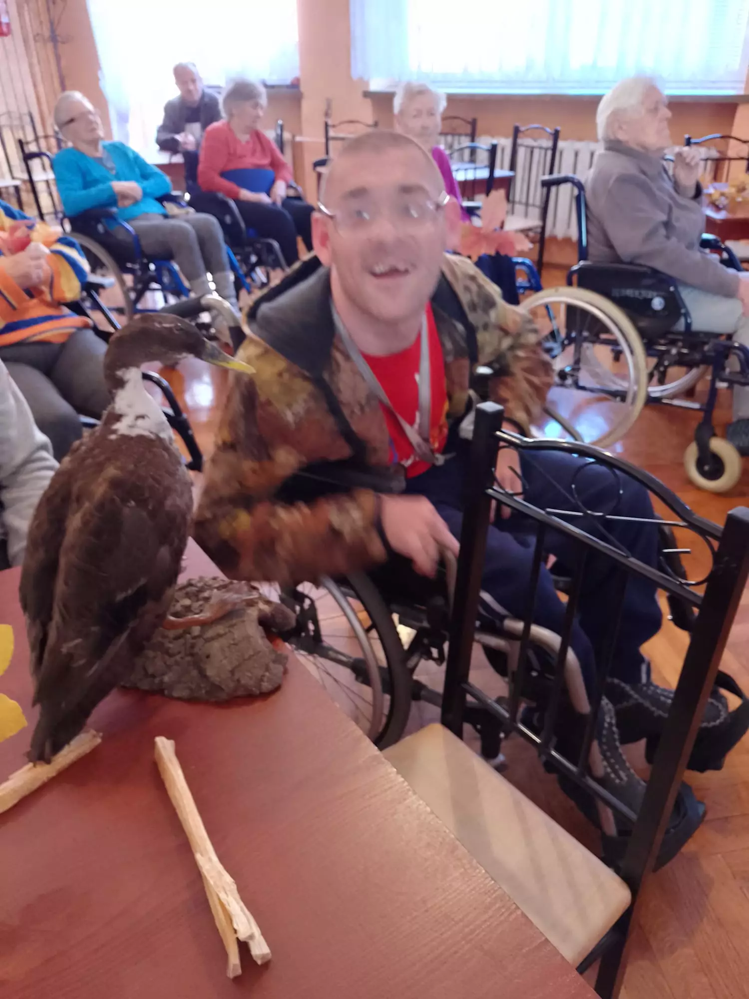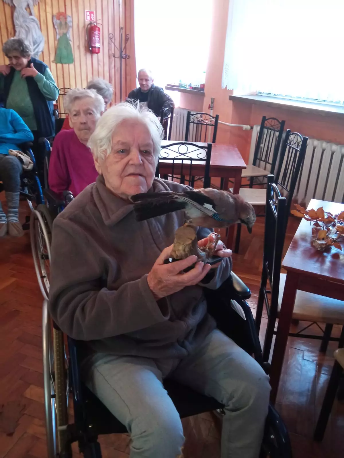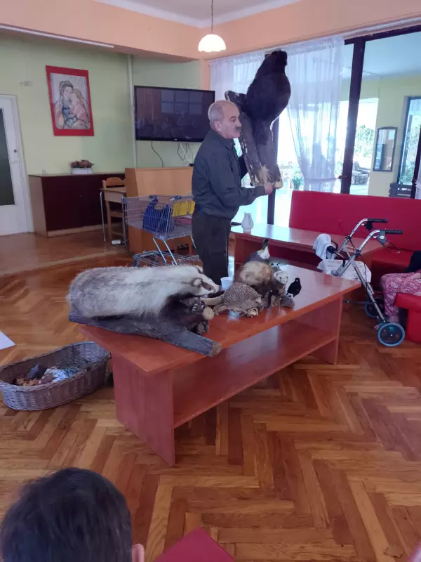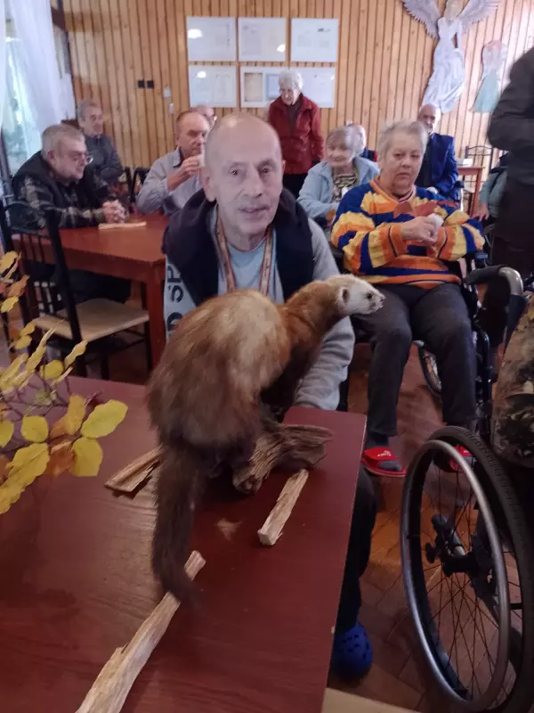 W naszym domu gościliśmy p. Czesława Tyrola, leśnika i pasjonata przyrody. Opowiedział nam w barwny sposób o bogatej faunie i florze naszego regionu. Nie były to tylko suche informacje ale ciekawe opowieści połączone z prezentacją modeli zwierząt występujących w naszych lasach i parkach. Mogliśmy zobaczyć oraz dotknąć bobra, borsuka, tchórza, łaskę, wiewiórkę, jeża, kreta, a z ptaków krogulca, sójkę i kosa. Pan Czesław potrafi także naśladować głosy zwierząt i mogliśmy je usłyszeć. Bardzo chętnie odpowiadał na pytania. W polu zainteresowań jest także historia naszego regionu le to już temat na następne spotkanie.