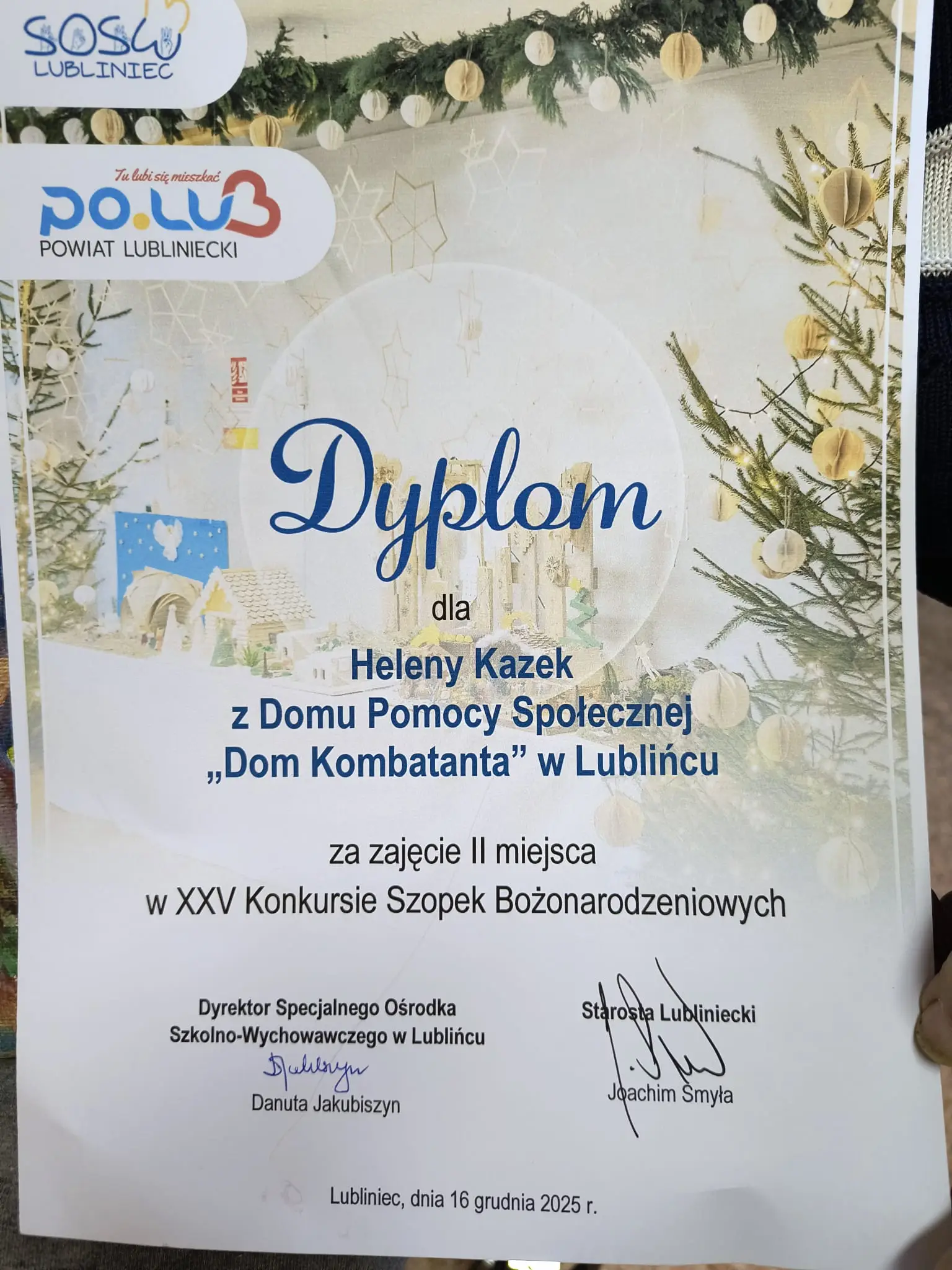 Z radością informujemy, że Pani Helena Kazek zajęła drugie miejsce w konkursie na szopkę bożonarodzeniową. Nagrodzona praca była własnoręcznie namalowanym dziełem, które zachwyciło jury pomysłowością oraz walorami artystycznymi.