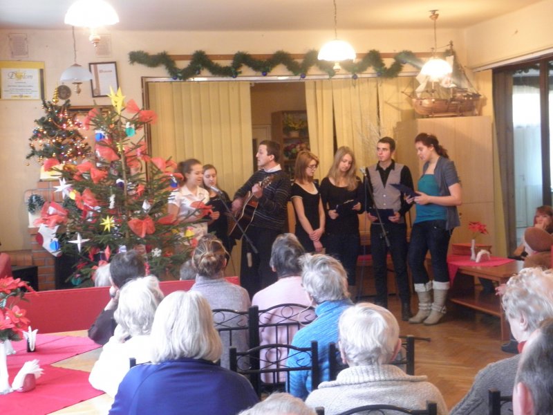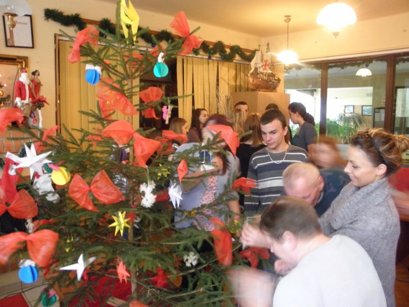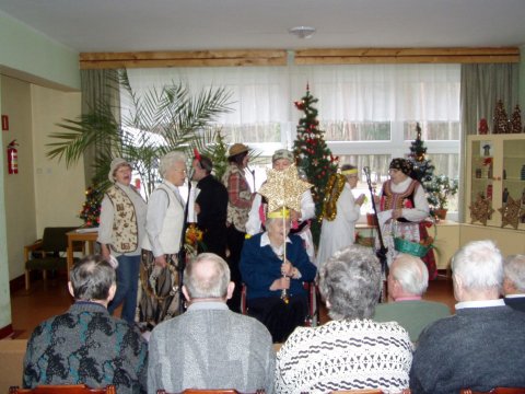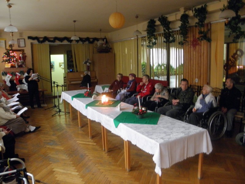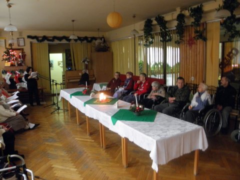 Święta Bożego Narodzenia w Domu Pomocy Społecznej „Dom Kombatanta" w Lublińcu to czas,w którym staramy się tworzyć autentyczną świąteczną atmosferę naszym podopiecznym. Pięknie przyozdobione choinki, spotkania opłatkowe, radosne jasełka, kartki z życzeniami od rodzin i bliskich, odwiedziny krewnych i przyjaznych ludzi, są trwałą tradycją Naszego Domu. W tym roku także odwiedzili nas mili goście. A byli nimi: dzieci i nauczyciele z gimnazjum w Pawonkowie, młodzież z Zespołu Szkół Zawodowych w Lublińcu i harcerze, którzy przynieśli światełko betlejemskie. Wyśpiewane przez młode głosy kolędy i pastorałki wzruszyły mieszkańców, a wspólne ubieranie choinki przygotowanymi przez młodzież ozdobami, było pięknym akcentem kończącym wizytę. Gorące podziękowania dla dzieci ze szkoły w Pawonkowie za żywą choinkę, młodzieży z Zespołu Szkól za ozdoby, obu zespołom zaś za urocze kolędowanie. Osobne podziękowanie kierujemy do nauczycieli: Katarzyny Respondek, Zofii Lampki i Adama Pietrygi. Na pewno takie kierowanie młodymi ludźmi jest godne uznania i naśladowania.