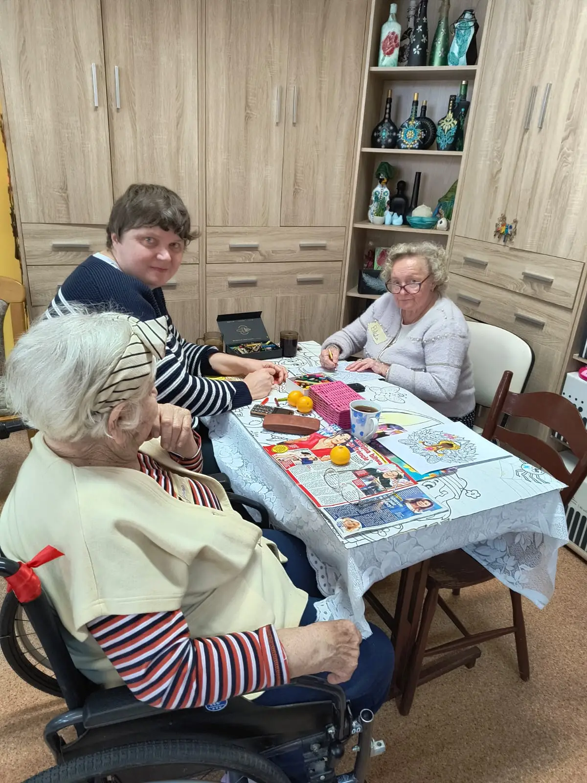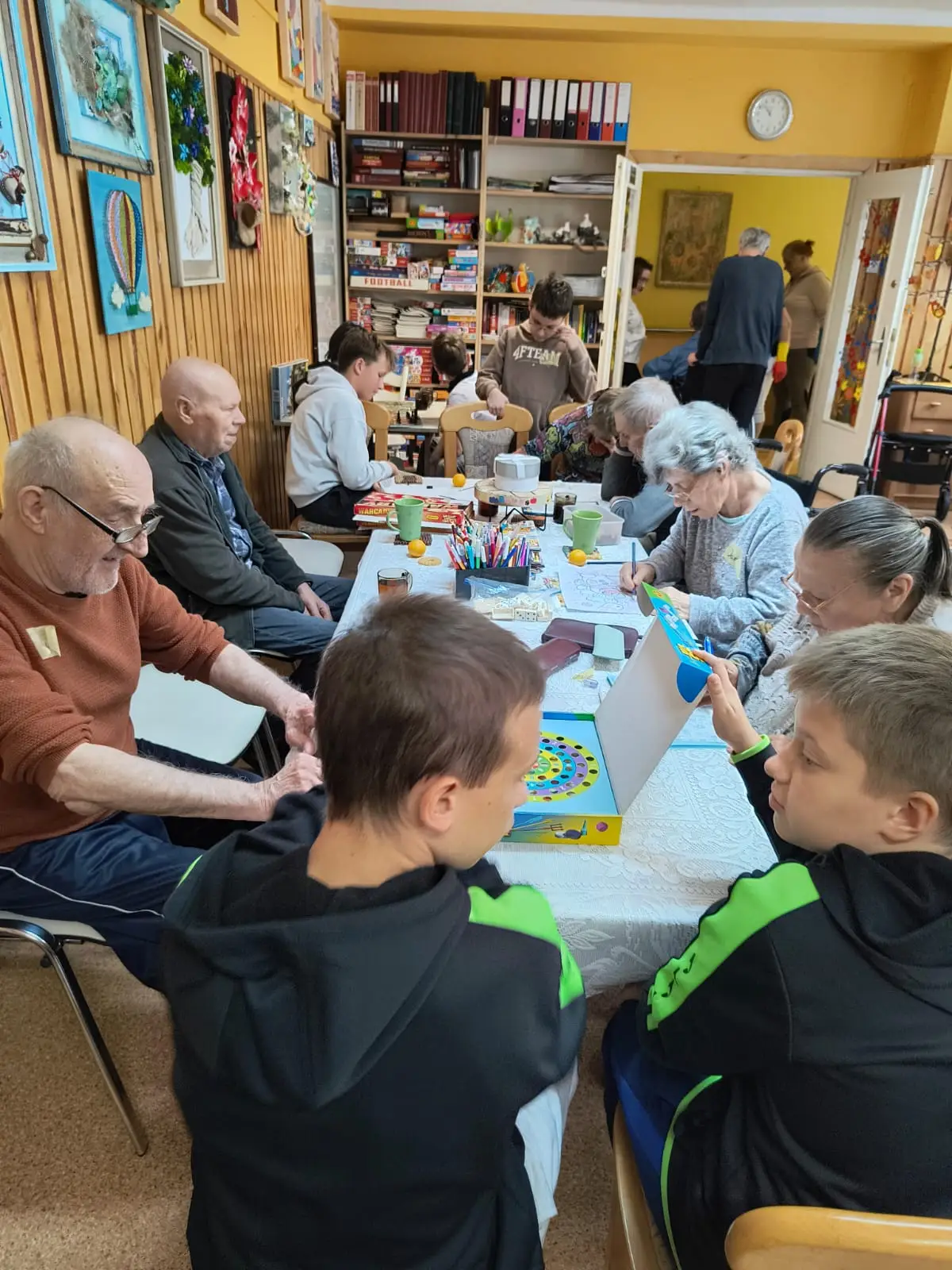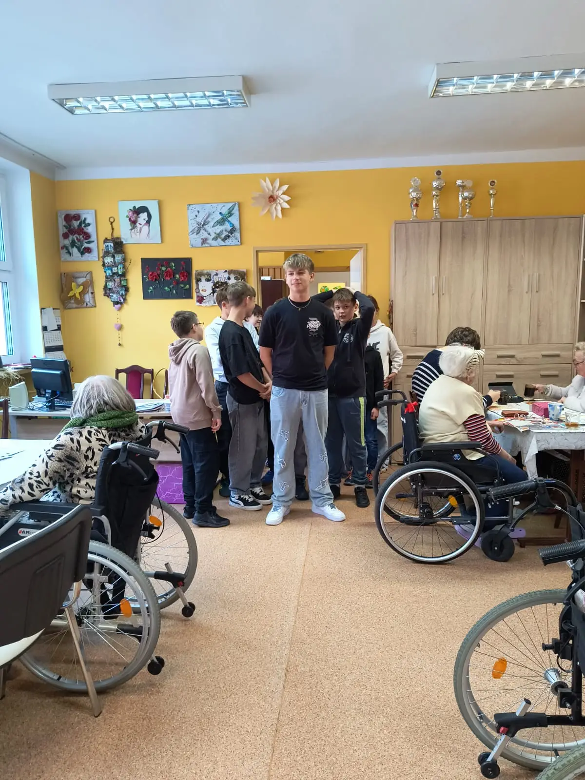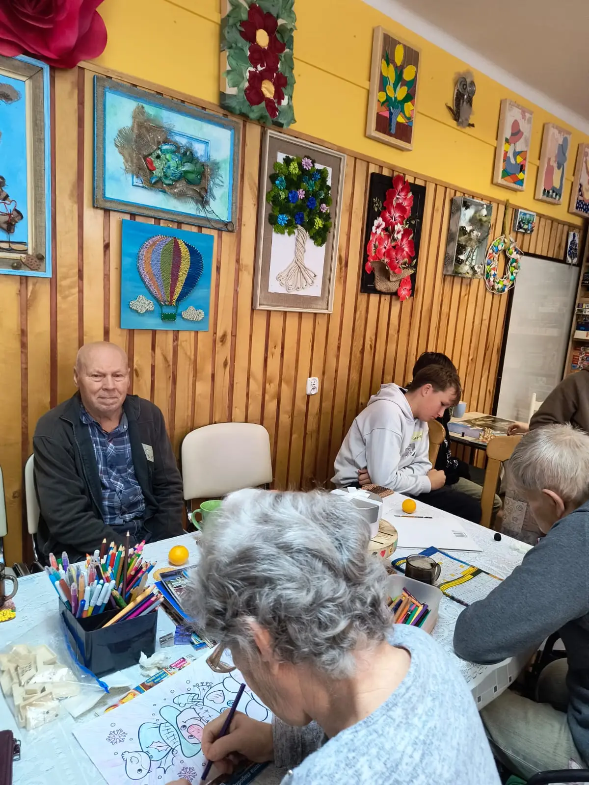 Uczniowie wręczyli naszym podopiecznym drobne upominki, co sprawiło wszystkim ogromną radość i wywołało wiele uśmiechów. Następnie odbyły się wspólne warsztaty plastyczne – pełne rozmów, wspomnień i twórczej zabawy. Na zakończenie spotkania wspólnie zaśpiewaliśmy kilka piosenek, a pamiątkowe zdjęcia utrwaliły te piękne chwile.