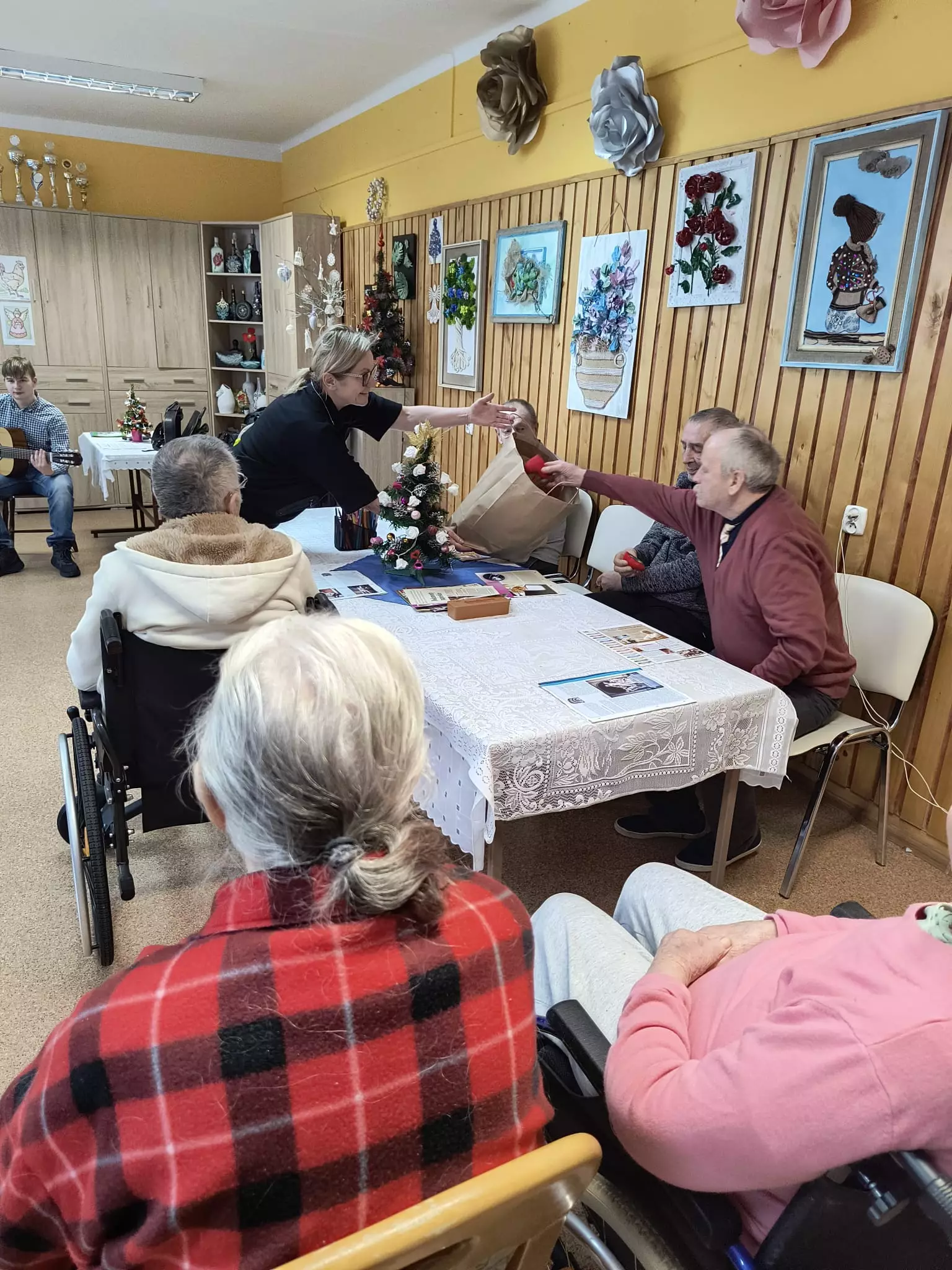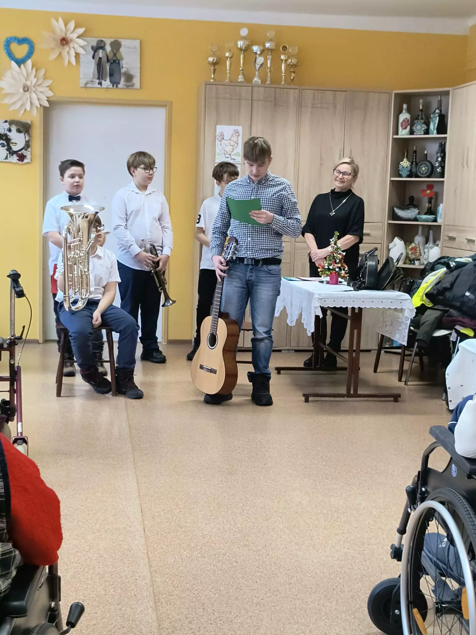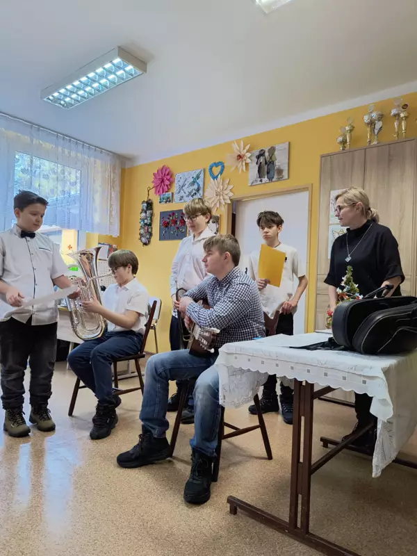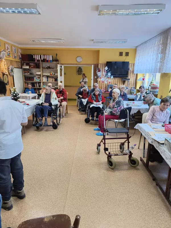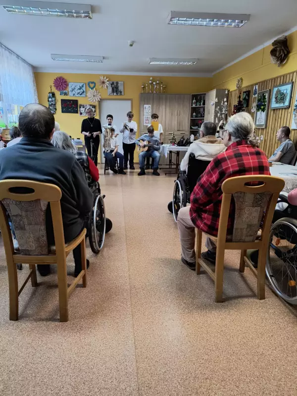 22.01.2024r odwiedziła nas grupa uczniów- wolontariuszy z SP nr.1. Dzieci przedstawiły dla naszych mieszkańców program artystyczny z okazji Dnia Babci i Dziadka. Zaprezentowali kilka kolęd przy akompaniamencie gitary, trąbki i eufonium. Do śpiewu włączyliśmy się wszyscy. Ponadto usłyszeliśmy piękne wiersze z podziękowaniami i życzeniami dla babć i dziadków. Spotkanie było niezwykle radosne i przebiegało w bardzo ciepłej atmosferze. Zostaliśmy obdarowani własnoręcznie wykonanymi serduszkami. Dzieci zapowiedziały się z następną wizytą. Jesteśmy wdzięczni za podjęty wysiłek aby sprawić radość naszym mieszkańcom.