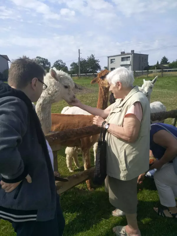 W czwartkowe lipcowe popołudnie spędziliśmy w bardzo miłym towarzystwie. Pojechaliśmy na ranczo z alpakami do Lisowic. Spędziliśmy radosne chwile w obcując z tymi zwierzętami. Alpaki pochodzą z Ameryki południowej sympatyczne zwierzęta o miękkim futerku wywołują uśmiech, pozwalają zrelaksować się, dostarczają wytchnienia gdyż mają łagodną naturę oraz delikatne usposobienie. Są niezwykle inteligentne nie boją się ludzi, są niezwykle ciekawskie i przede wszystkim uwielbiają towarzystwo. Z tego powodu wykorzystywane są do alpakoterapii, niezwykle cenna jest ich wełna ponieważ jest delikatna i ma właściwości prozdrowotne. Alpakom towarzyszyły owce kameruńskie, kozy, konie, kucyki, osioł, króliki i inne ozdobne ptactwo. Mieliśmy okazję dokarmiać zwierzęta i poprzytulać się z nimi. Wycieczkę zakończyliśmy kawą oraz pysznymi lodmi.